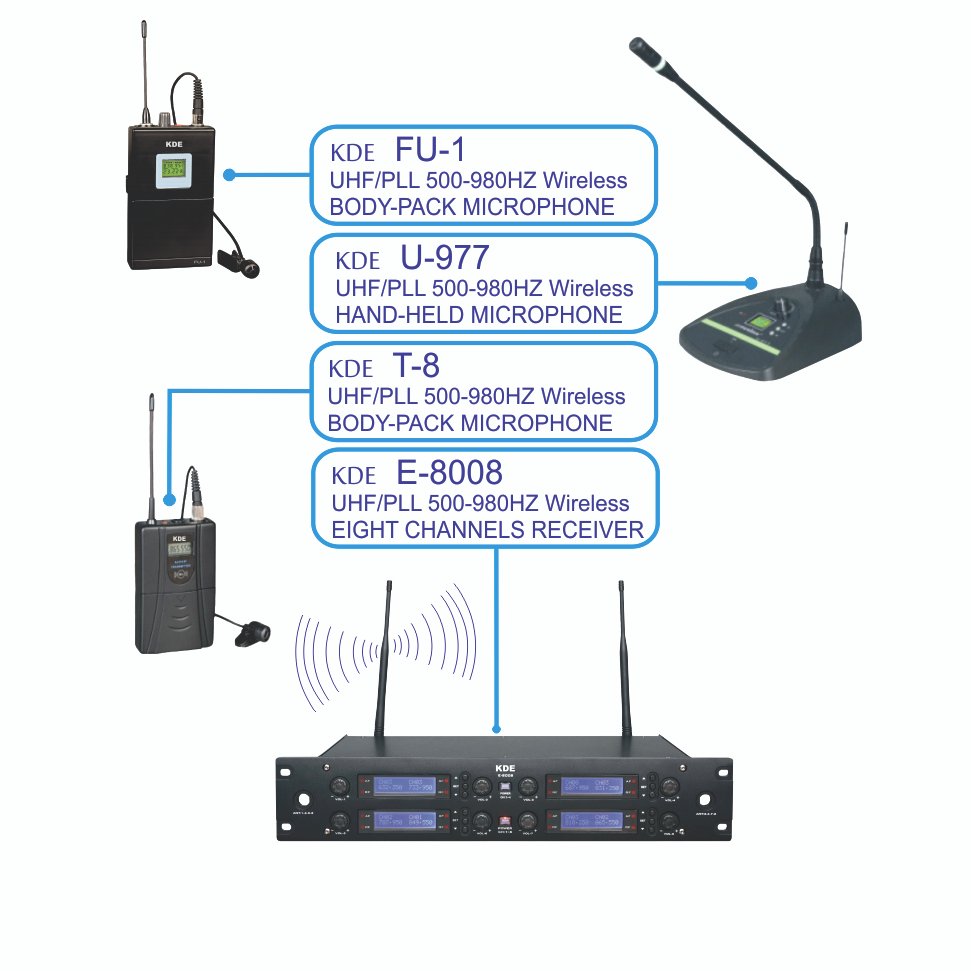 Dãy tần số: UHF 500-980MHz thông qua CPU điều khiển. Với kỹ thuật kết hợp PLL: 03 nhóm tần số hệ thống. Mỗi nhóm có thể sử dụng 04 bộ cùng thời điểm mà không bị ảnh hưởng (3 * 4 = 12 bộ phát tín hiệu), 02 nhóm tần số có thể sự dụng 3 * 4 = 12 bộ (3 * 4 * 4 = 48 bộ phát tín hiệu).