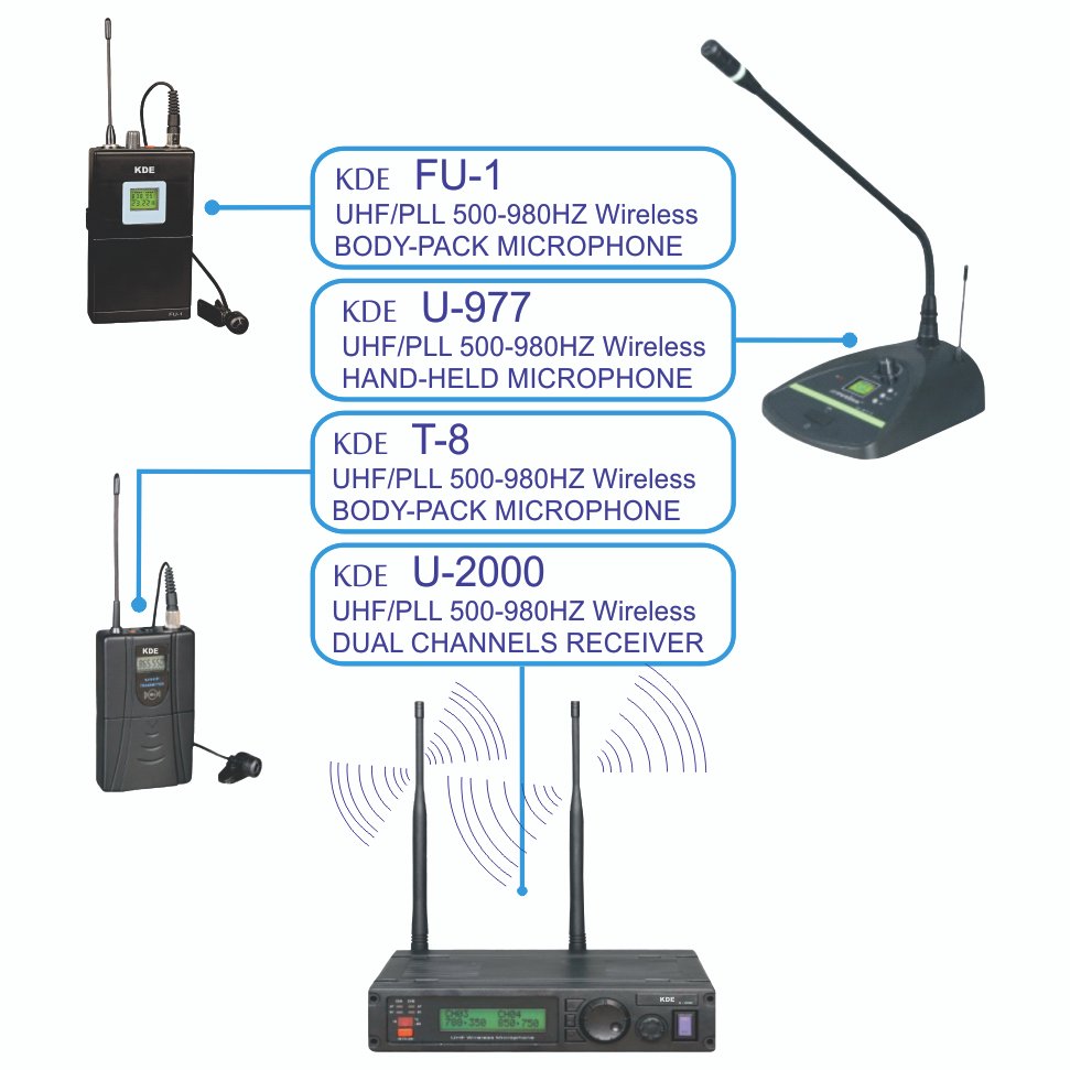 Dãy tần số: UHF 500-980MHz thông qua CPU điều khiển. Với kỹ thuật kết hợp PLL: 03 nhóm tần số hệ thống. Mỗi nhóm có thể sử dụng 04 bộ cùng thời điểm mà không bị ảnh hưởng (3 * 4 = 12 bộ phát tín hiệu), 02 nhóm tần số có thể sự dụng 3 * 4 = 12 bộ (3 * 4 * 4 = 48 bộ phát tín hiệu).